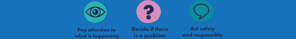 A bystander is a person who is there when something happens and who sees it but does nothing about it. An active bystander means knowing when someone’s behaviour is not okay or scary and doing something.